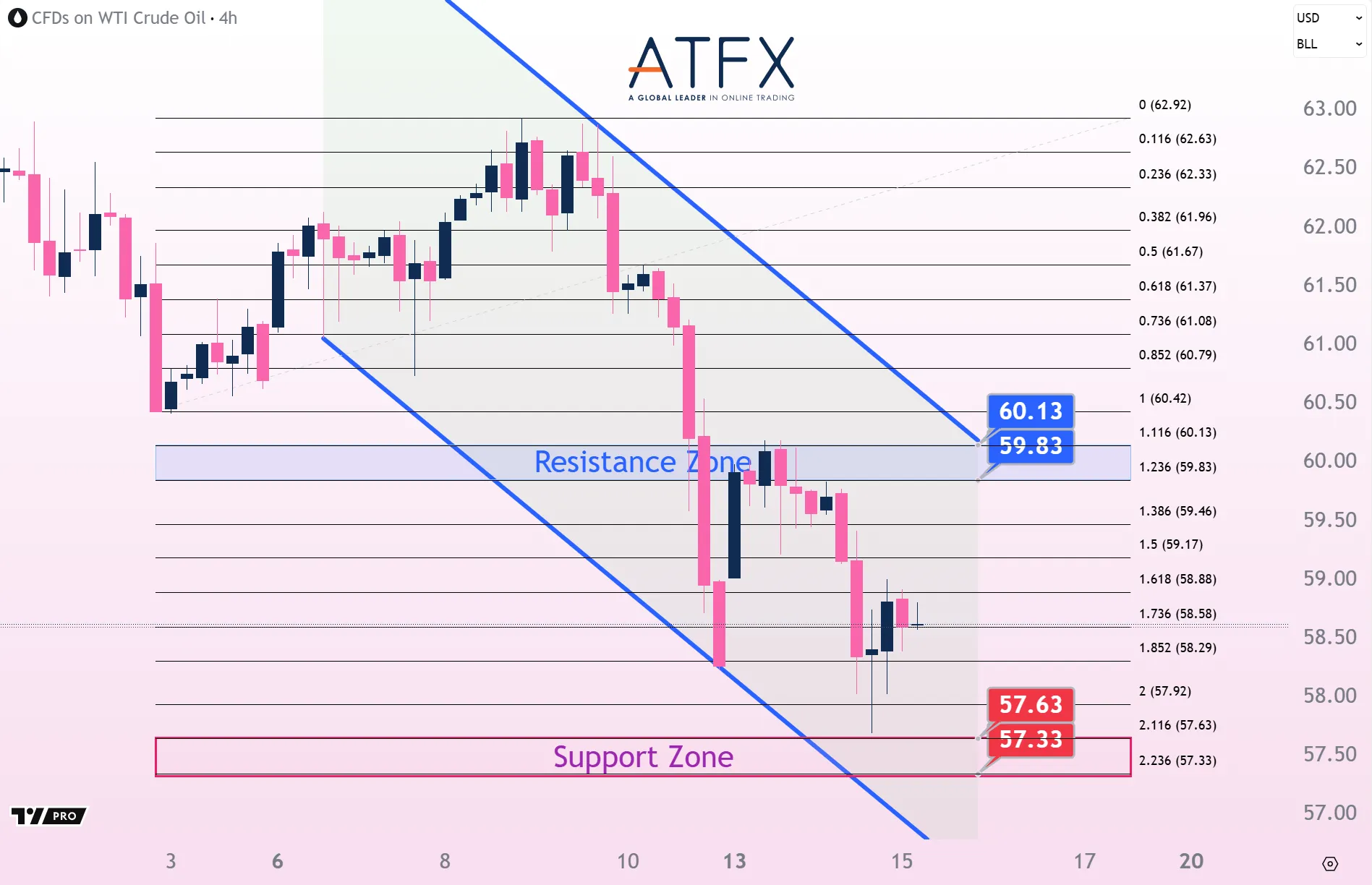 WTI slumped to $58.70, its lowest in five months, after the IEA projected a potential four mbpd surplus in 2026, while renewed U.S.-China trade tensions weighed on demand sentiment. Technically, price remains capped by the descending trendline near $59.83, with bearish momentum pointing toward support at $57.63. A sustained break below this level could extend losses toward the mid-$56 zone.
