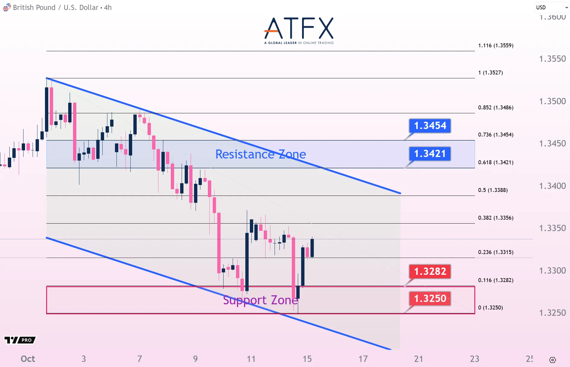GBP/USD slipped to 1.3326 as UK unemployment rose to 4.8% and wage growth slowed to 4.7%. Technically, the pair is rebounding from trendline support but remains capped by 1.3420. A potential “M-top” structure is developing; failure at 1.3420 could trigger renewed downside toward 1.3280. Only a confirmed breakout above 1.3420 would invalidate the bearish setup and open the path to 1.3500.