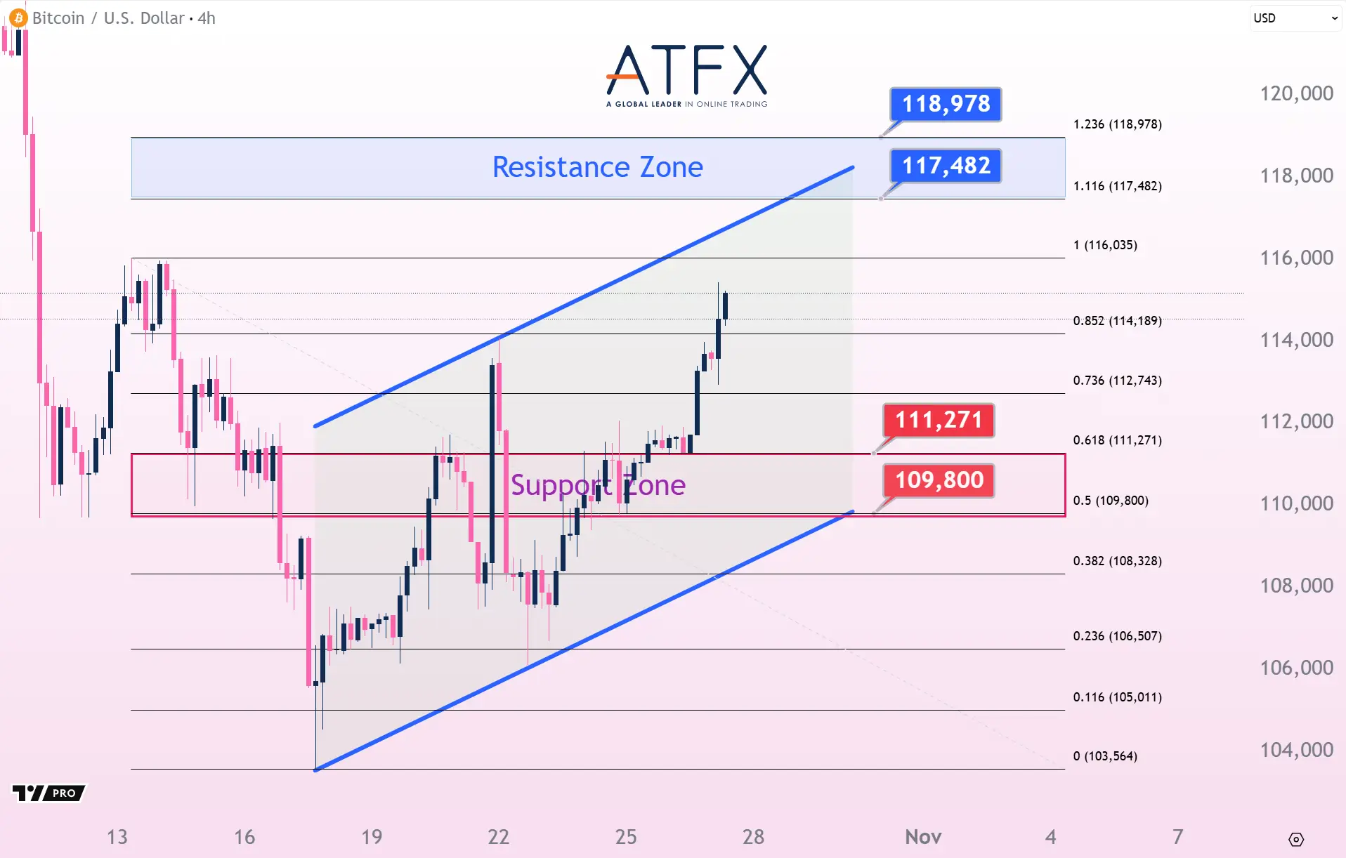 Bitcoin climbed to around $111K, posting a 2% weekly gain as easing U.S.-China trade tensions and softer inflation boosted risk appetite. The confirmation of a Trump–Xi meeting at the APEC summit lifted sentiment across equities and crypto. Technically, BTC holds support near $111,271, while resistance at $117,482 remains the key upside barrier, with potential to test $119K if momentum extends.