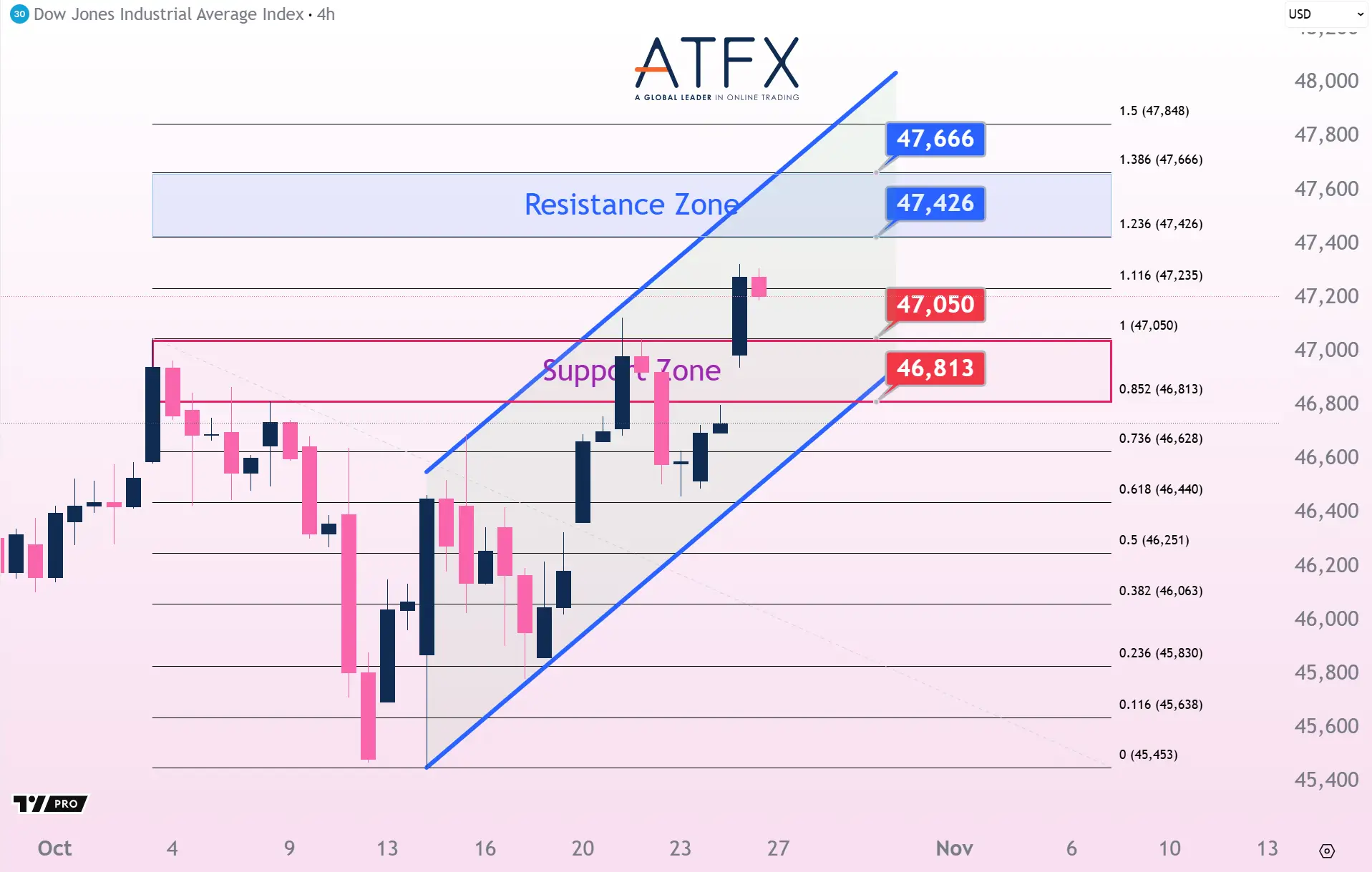 The Dow Futures surged 1.01% to 47,207, logging its best weekly gain since June, supported by robust earnings and Fed rate cut bets. On the chart, price holds above 47,050 and targets 47,426, with momentum favoring a bullish continuation toward $4,7426 or even 47,666 if support remains intact.