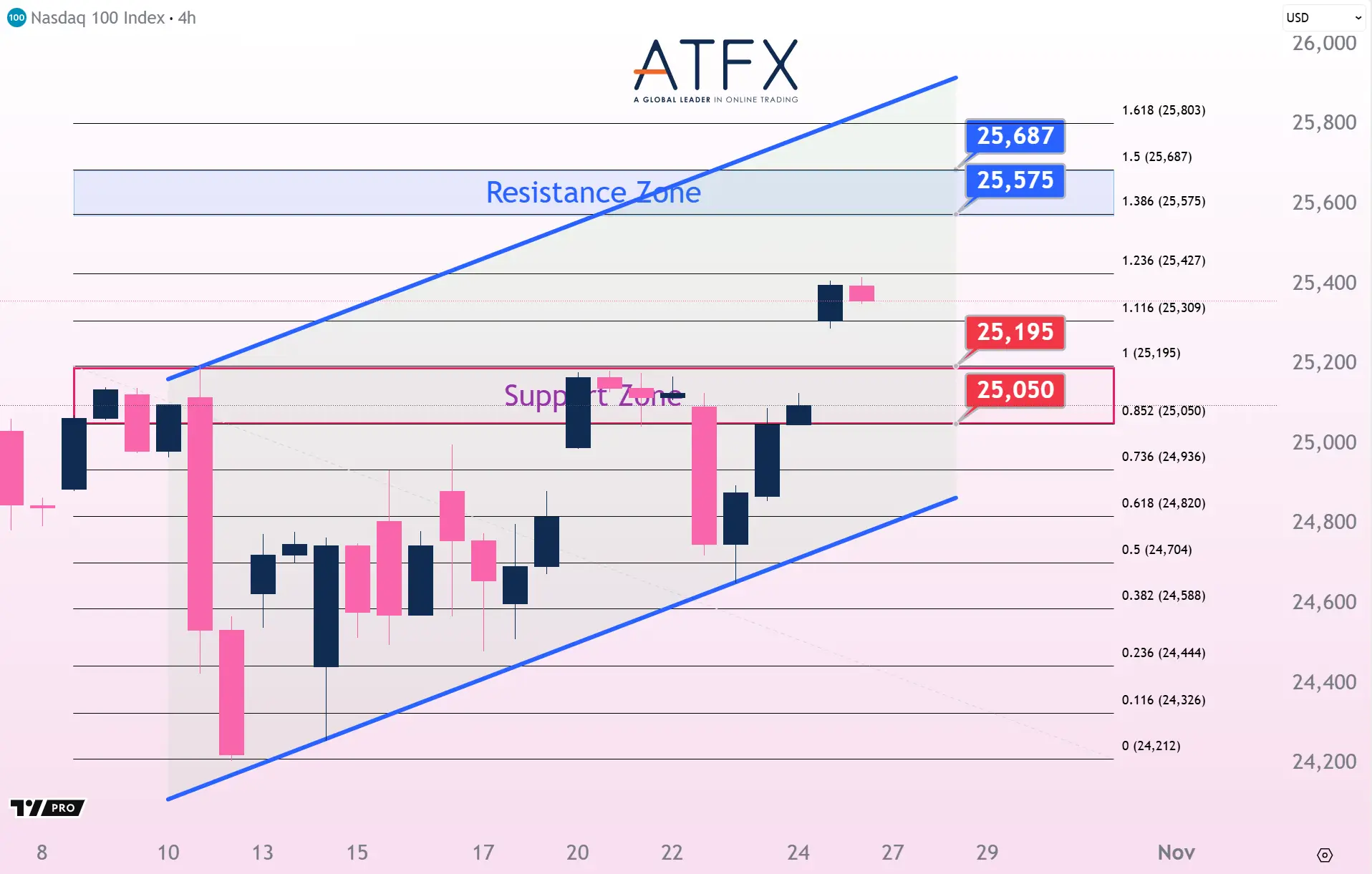 NAS100 gained 1.15% to 23,204, its best week since August, supported by strong tech earnings and AI momentum. Technically, the index is holding above the 25,195 support zone, with an ascending trendline offering additional strength. A sustained push above 25,400 could open the way toward 25,575, while failure to hold above the support zone and breakout of the ascending trendline risks a deeper pullback.