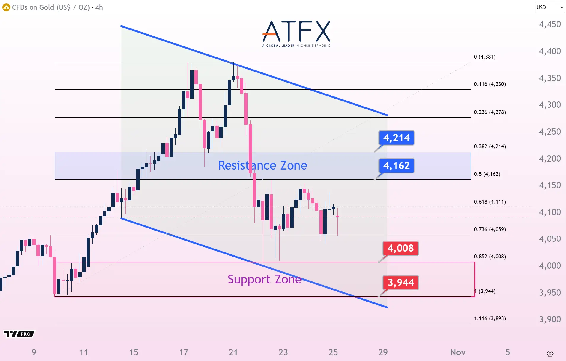 Spot gold traded near $4,083 per ounce, marking its first weekly loss in 10 weeks (-3%) amid easing trade tensions, which curbed safe-haven demand. Technically, prices are consolidating between key support at $4,008 and resistance at $4,162, with the breakout direction likely to shape the next trend.