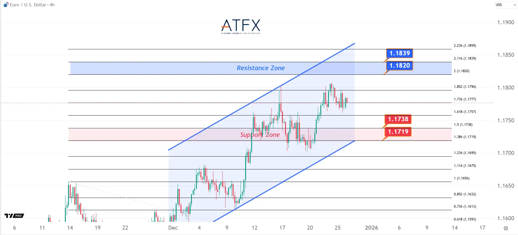 EUR/USD remains supported by a softer dollar amid expectations of a Fed cut in 2026. Technically, price stays within an ascending channel, holding above 1.1719–1.1738 support while facing resistance at 1.1820–1.1839, keeping near-term action range-bound with a mild bullish bias.