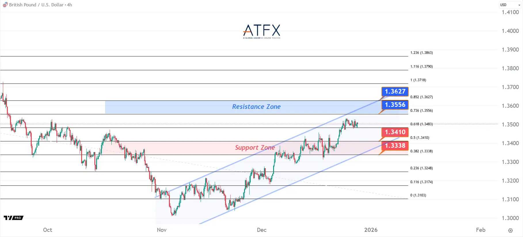 Sterling continues to grind higher alongside USD weakness, though upside momentum is showing signs of hesitation. Price action remains constructive within an ascending channel, with consolidation around 1.3500, while pullbacks toward 1.3410 would likely be viewed as corrective rather than trend-breaking.