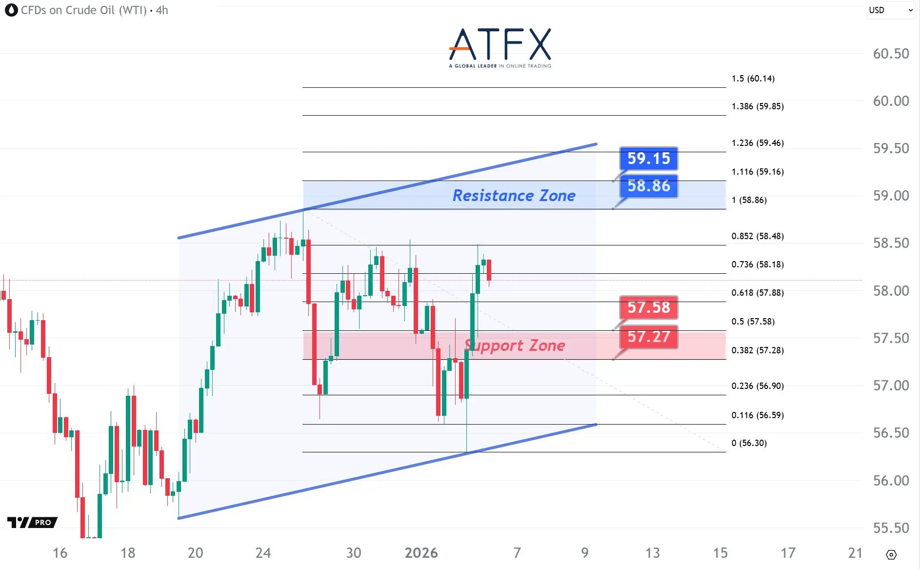 WTI spiked as traders reassessed Venezuela-related supply risks, but upside momentum faded near the $58.86–$59.16 resistance zone. The market is now weighing whether supply disruptions will translate into actual barrel losses, rather than pricing a clear trend shift. As long as $57.28–$57.58 holds, price action favors volatile range trading over directional moves.