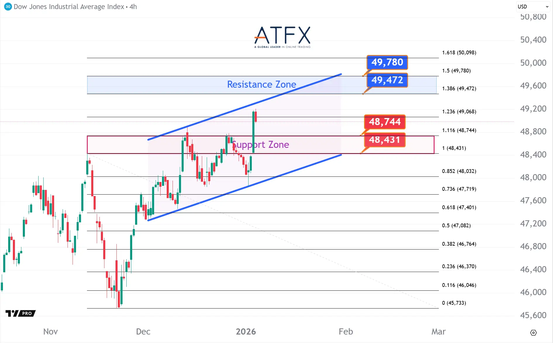 The Dow Futures pushed to fresh record highs, led by strength in energy and financial stocks, as markets lean toward a “risk-contained” view. Despite ongoing geopolitical headlines, investors appear confident that U.S. actions in Venezuela will not escalate into a prolonged conflict. With bids holding above 48,431–48,744, focus now shifts to the 49,472–49,780 area as the next zone of hesitation.