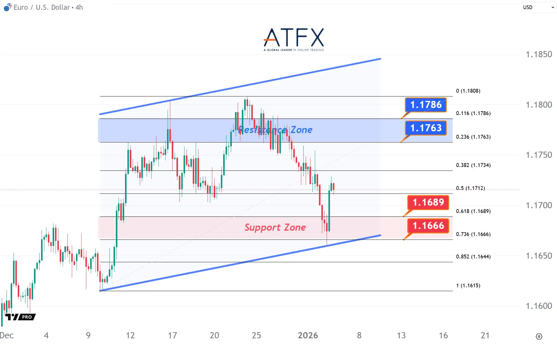 EUR/USD stabilized around the 1.17 handle after the recent pullback, suggesting limited follow-through from the dollar’s rebound. Repeated failures above 1.1763 have shifted price action into consolidation mode as markets await key U.S. labor data. As long as the 1.1666–1.1689 area holds, the move appears corrective rather than a trend of reversal.