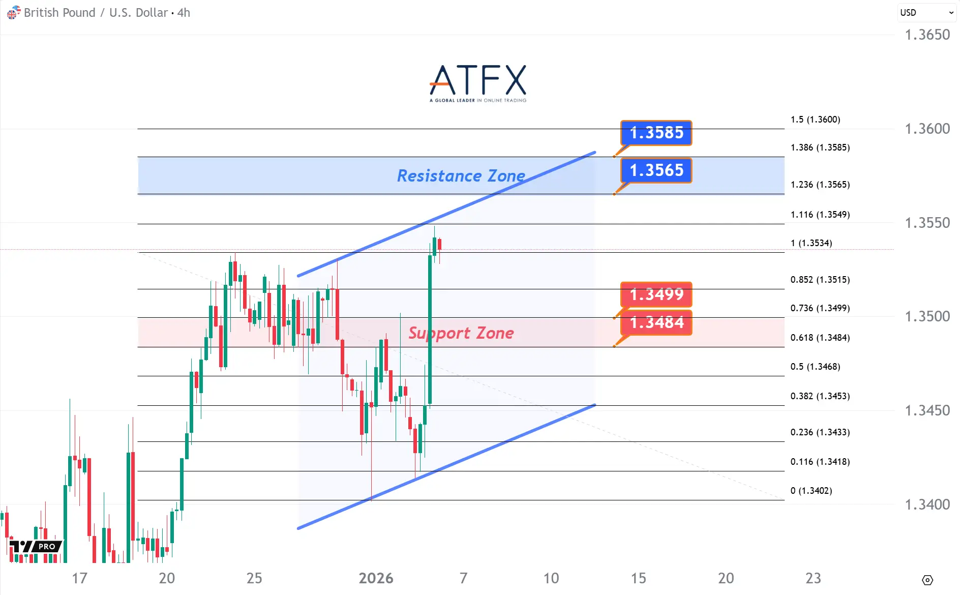 GBP/USD has eased from recent highs as modest safe-haven demand supports the dollar, though downside follow-through remains limited. Price action below 1.3499 suggests consolidation rather than reversal, with dip-buying interest likely to emerge near 1.3499–1.3484. Friday’s NFP remains the key catalyst for near-term direction.