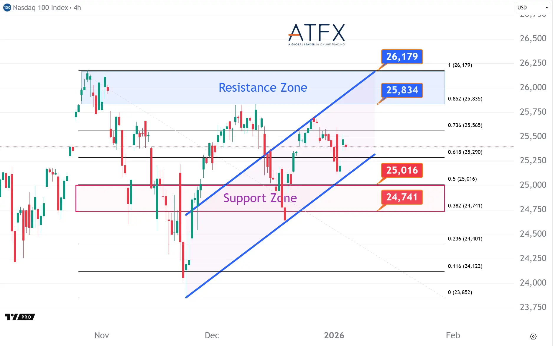 The NAS100 continues to rebound but lags the Dow, highlighting persistent divergence within tech stocks. Repeated hesitation above the 25,834 area suggests investors remain cautious toward elevated valuations, with gains driven more by sentiment repair than fresh conviction. The 25,016–24,741 zone is key near-term support, holding which favors consolidation over a deeper pullback.