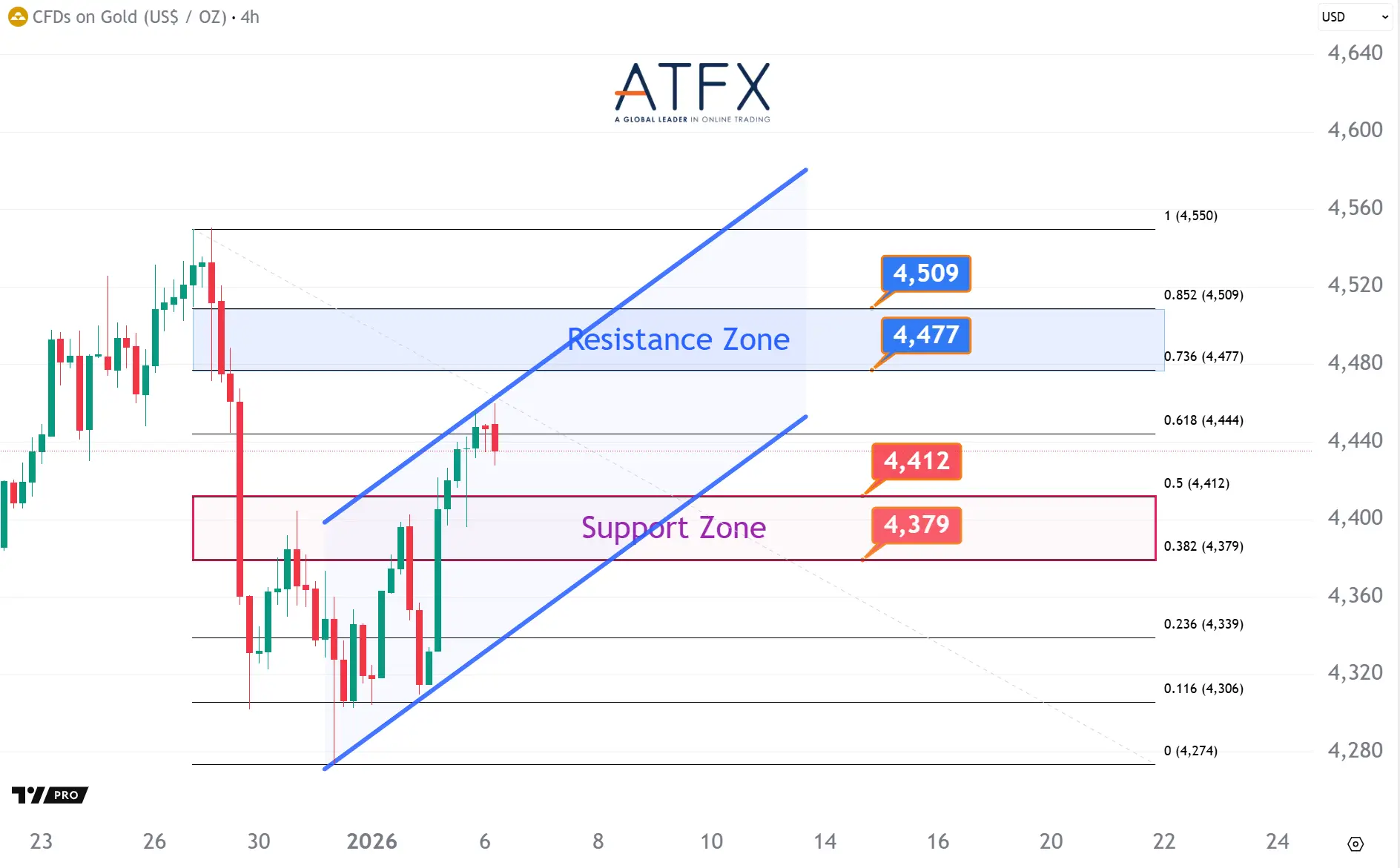 Gold pushed to a one-week high as geopolitical tensions revived demand, but upside stalled near the $4,477–$4,509 area, where selling interest emerged. Price action suggests consolidation rather than an aggressive breakout, as markets wait for clearer escalation in risk sentiment. As long as the $4,379–$4,412 zone holds, the broader bullish structure remains intact.