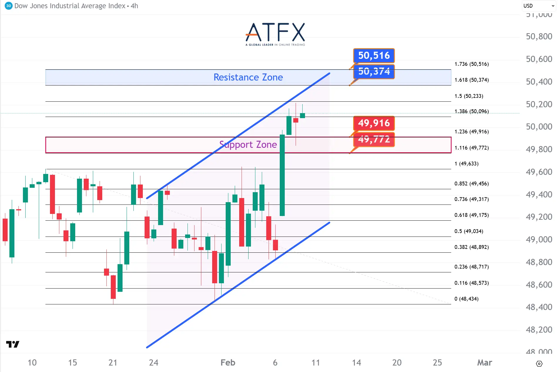 The Dow Futures notched a second consecutive record close as tech shares rebounded and earnings remained supportive. Price is holding above the 49,772–49,916 support area, with upside probing towards the 50,374–50,516 resistance zone. Attention now turns to U.S. jobs and inflation data, which will determine whether momentum can extend at elevated levels.