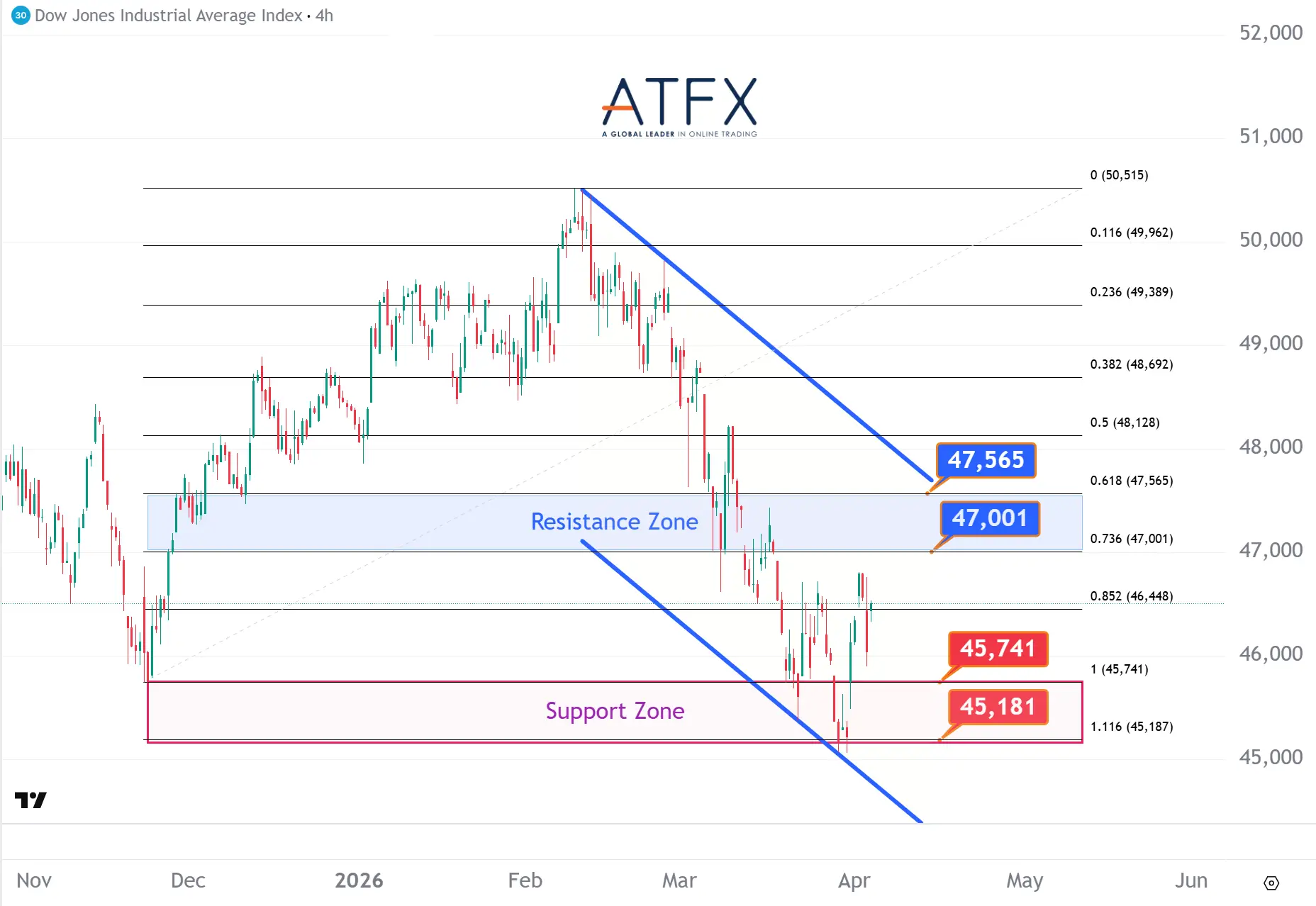 - Support: 45741/45188 The Dow fell 0.13% to 46,504.67 as oil-driven inflation fears returned. Trump’s vow to persist with Iran strikes dampened the early-week recovery, though it still closed its first winning week since the war began.
