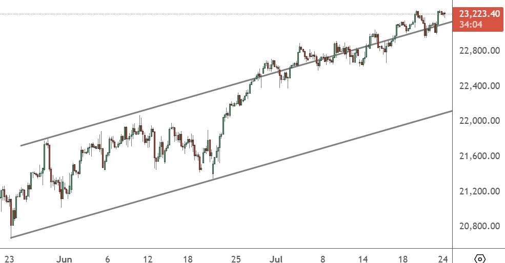 The price of NAS 100 has been training the uptrend line from May and continues to see buyers. There is the potential for another leg higher but a correction would target the 22,000 level.
