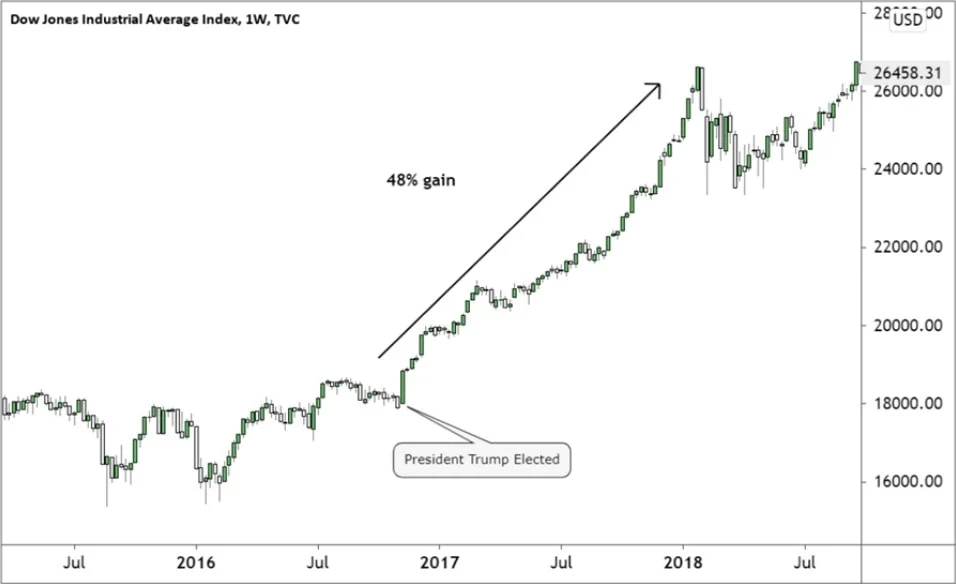 The election of President Donald Trump in December 2016 triggered an unexpected 48% rally in the Dow during the two years.