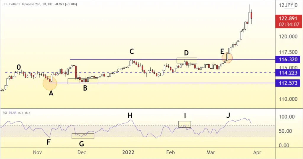 The USDJPY daily chart below shows that the price oscillated between the 112.57 support level and the 116.32 resistance level, followed by a trend on a break above the horizontal resistance level at 116.32 (point E).