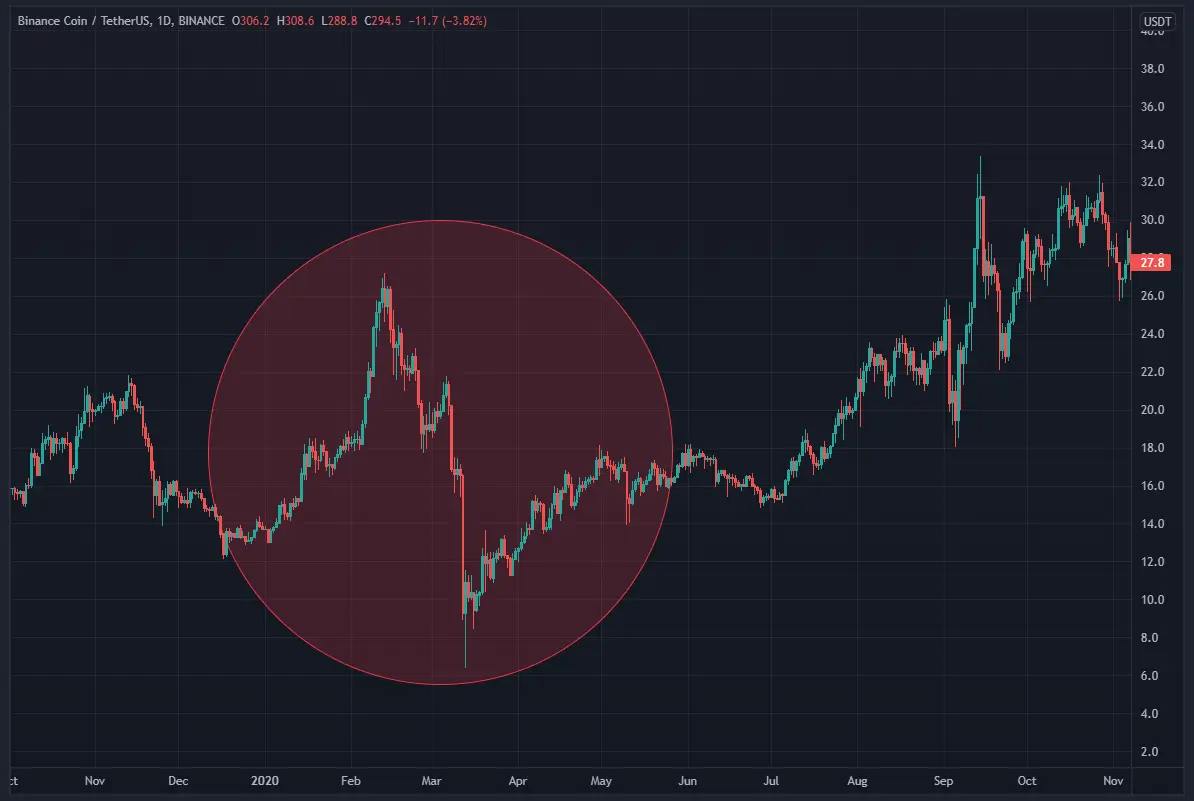 By February 2020, BNB was trading just above $26.90 just before the global financial markets crashed due to the pandemic-induced worldwide lockdowns. Binance Coin price also crashed in March 2020 and dipped to a low of $6.40, showing that the Binance Coin price was prone to global economic uncertainty just like other assets. In the 3rd quarter of 2020, the equities and traditional markets started booming again, and the BNB price followed suit.