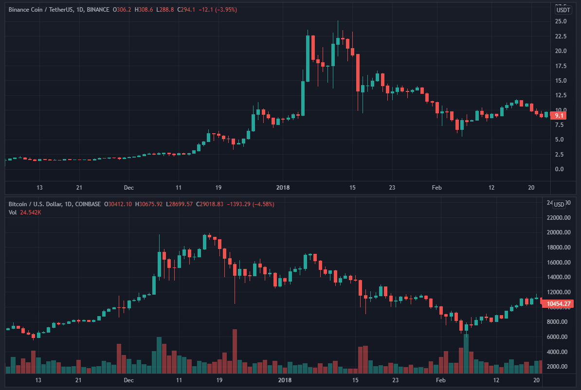 Like most other cryptocurrencies, a direct correlation can be seen between the BNB Coin and Bitcoin prices. This fact became evident when the Bitcoin price soared to record highs in 2017. The massive influx of retail investors into crypto pushed the BTC price above $20,000 in December 2017. Since most cryptocurrencies were paired against Bitcoin on exchanges, their prices also went ballistic. In January 2018, the Binance Coin price hit its then all-time high of $25.20, a whopping increase of 168 times from its ICO price of $0.15 in five short months.
