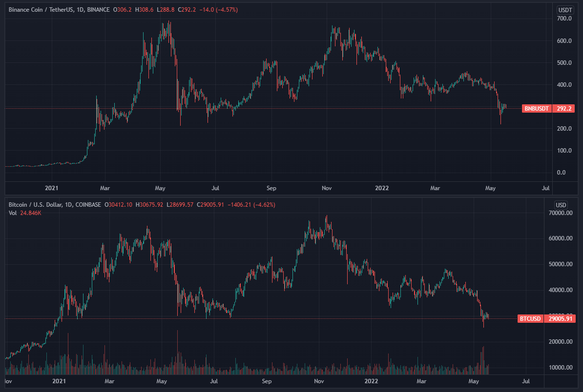 After topping out at $69,000, Bitcoin trading went into a downtrend again. The ongoing bearishness has forced the Binance Coin price into a downward spiral. The coin is now trading at $294, which translates into a 58% decrease from its May 2021 highs of $691.80. This correlation also suggests that any future Binance Coin price prediction depends on Bitcoin’s price action.