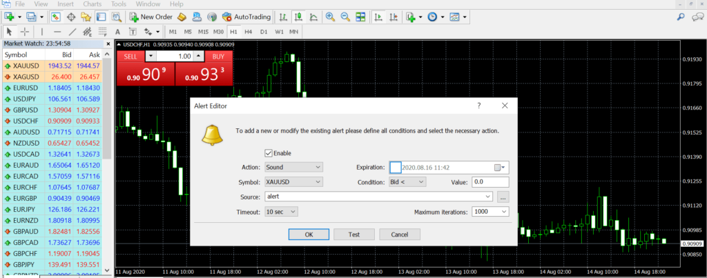 Setting up a price-alert is simple. Open the Terminal window at the bottom of the screen by pressing CTRL+T on your keyboard and choosing the ‘Alerts’ tab.