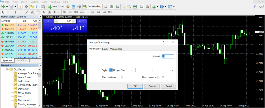 To add to your charts, simply drag the trading-indicator from the navigator window and drop it on the chart. A pop-up window will appear where you can customise the indicators.