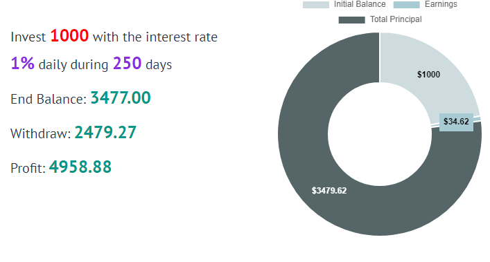 Tài sản CFD cho phép nhà giao dịch mua hoặc bán và tận dụng lợi thế của giá tăng và giảm. Vì vậy, làm thế nào để giao dịch CFD của S&P 500 có thể mang lại lợi nhuận tiềm năng 300% một năm, thay vì 300% trong 20 năm như chỉ số chính được giao dịch? Chúng ta hãy sử dụng một công thức tăng trưởng kép đơn giản, giả định rằng nhà giao dịch sẽ giao dịch CFD trên chỉ số S&P 500 trong 250 ngày trong số 300 ngày giao dịch trong một năm, với số vốn khởi điểm là 1.000 USD. Các giao dịch sẽ tìm cách kiếm 1% lợi nhuận hàng ngày, tái đầu tư và gộp 50% của tất cả các khoản lợi nhuận hàng ngày được thực hiện và nhận phần còn lại của khoản lãi phần trăm dưới dạng thanh toán bằng tiền.