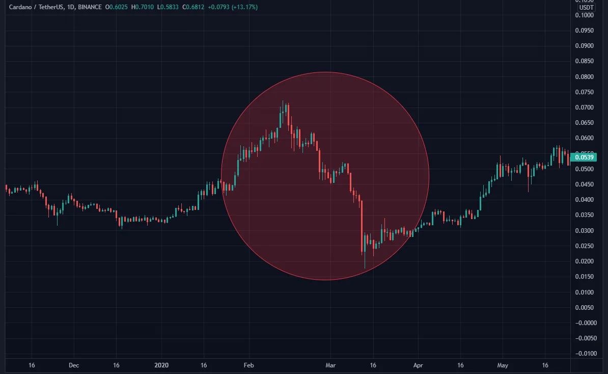 Đến tháng 2/2020, ADA được giao dịch ở mức 0.07 USD. Ngay sau đó, thị trường toàn cầu giảm do lo ngại về đại dịch vi-rút corona gây ra tình trạng đóng cửa trên toàn cầu. Kết quả là, giá ADA đã giảm, chạm mức thấp kỷ lục 0,0192 USD vào tháng 3/2020. Biến động này cho thấy giá Cardano cũng dễ bị ảnh hưởng bởi bất ổn kinh tế toàn cầu giống như bất kỳ loại tài sản nào khác. Khi thị trường chứng khoán vàthị trường tài chính truyền thống bắt đầu phục hồi vào nửa cuối năm 2020, token ADA cũng đi theo xu hướng.