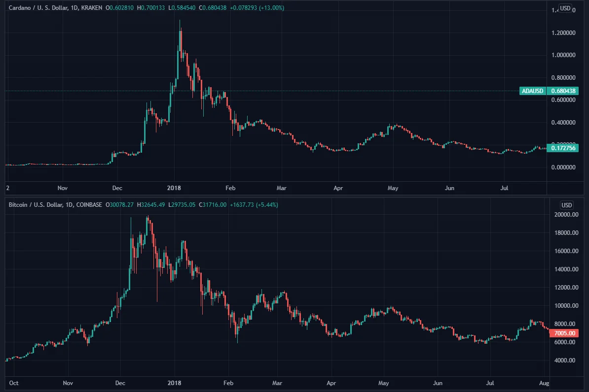 Biểu đồ trên cho thấy mối tương quan giữa giá ADA và BTC Kraken trong năm 2017-2018. Khi giá Bitcoin bước vào thị trường giảm, giá ADA cũng giảm mạnh. Do đó, Cardano đã rơi vào xu hướng giảm nghiêm trọng trong những năm tiếp theo khi nhiều nhà đầu tư ban đầu rút tiền mặt.