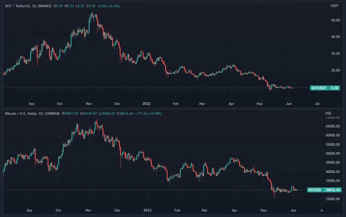 Mối tương quan về giá giữa DOT và Bitcoin trong nửa cuối năm 2021 thể hiện khá rõ ràng trong biểu đồ trên. Sau khi chạm đáy tại mức khoảng $29.000 vào tháng 6 năm 2021, giá BTC đã tăng lên $69.000 vào tháng 11 năm 2021. Tất cả các altcoin theo Bitcoin tăng cao hơn và giá Polkadot chạm mức $55 trong cùng tháng. Đây là mức tăng giá 4.500% so với mức thấp nhất vào tháng 7 năm 2021 là $10,37.
