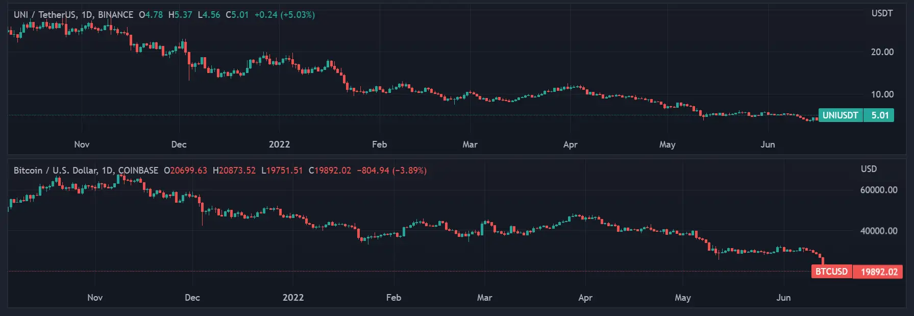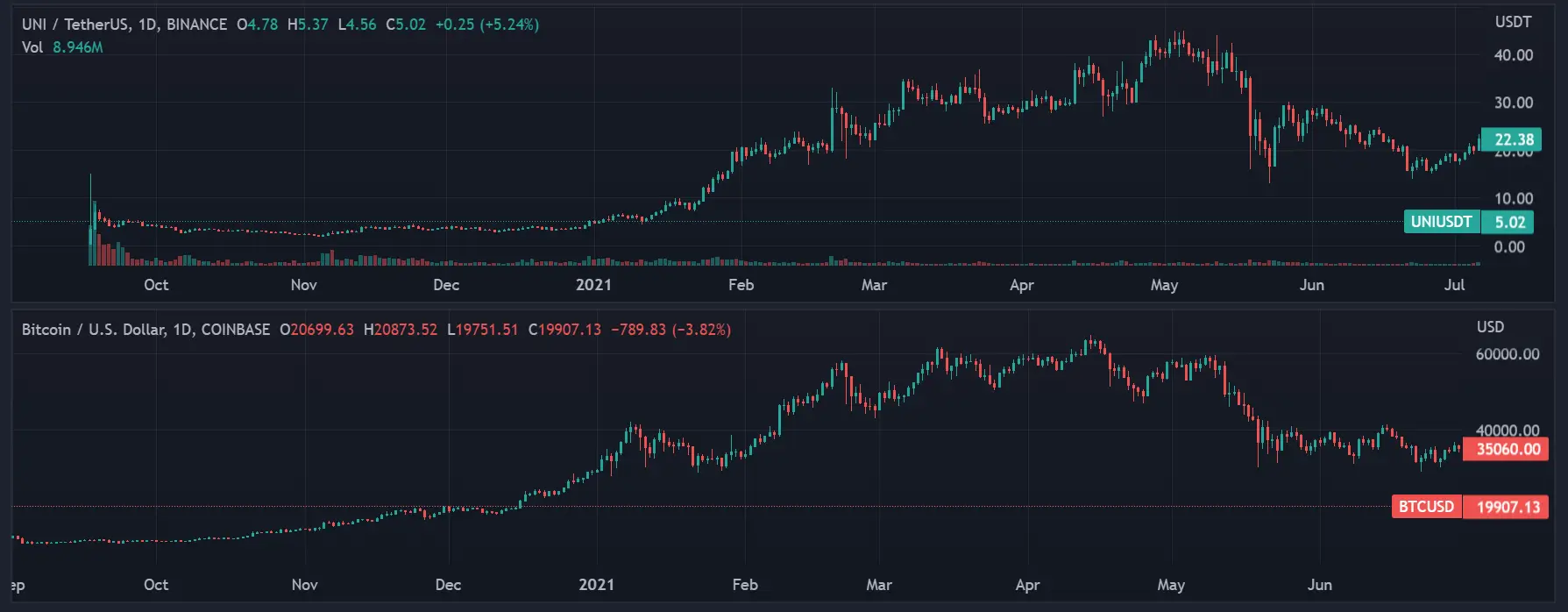 Vào tháng 5/2021, BTC đã giao dịch quanh mức 60.000 USD sau khi đạt mức cao nhất là 65.000 USD vào tháng 4. Đây là khi sự sụp đổ bất ngờ của Bitcoin đã làm rung chuyển toàn bộ thị trường tiền điện tử. Đợt bán tháo lớn đã khiến giá Bitcoin xuống dưới 29.000 USD vào tháng 6/2021. Giá Uniswap cũng có một cú chạm lớn và giảm mạnh xuống còn 14 USD vào tháng 7/2021, chứng tỏ rằng giá Uniswap gắn liền với hành động giá của Bitcoin, giống như tất cả altcoin khác.